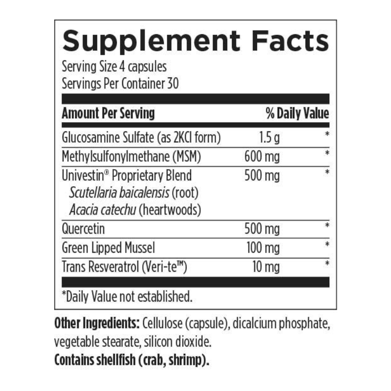 ArthroSoothe Supreme offers ideal nutritional support for joint health and function. It provides a synergistic blend of joint-supportive compounds including glucosamine sulfate, New Zealand green-lipped mussel, methylsulfonylmethane (MSM), quercetin, trans-resveratrol (as Veri-te™), and a proprietary blend of the plant extracts Scutellaria baicalensis and Acacia catechu.