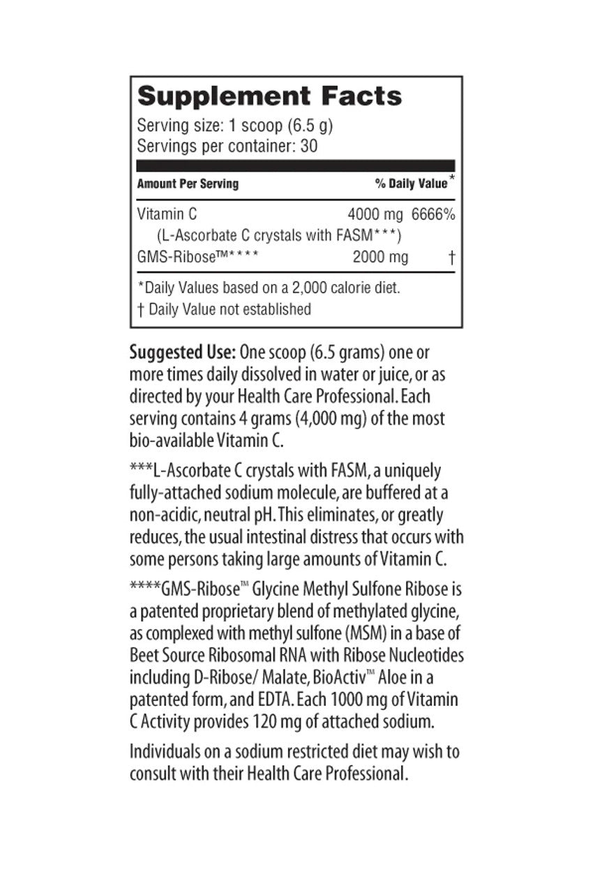 Vitality C is a pleasant tasting, non-acidic, high potency Vitamin C powder enhanced with a GMS Ribose Complex. It contains 4 GRAMS (4000mg) of Vitamin C per teaspoon that can be taken without stomach upset, gas or diarrhea that usually comes with high doses of Vitamin C. Our Vitality C utilizes four unique uptake pathways for superior absorption: